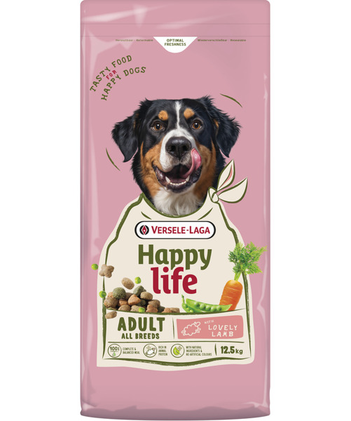 Happy life Adult met Lam is een lekkere en gevarieerde voeding met lam die alle voedingselementen aanbrengt voor de vitale volwassen hond.